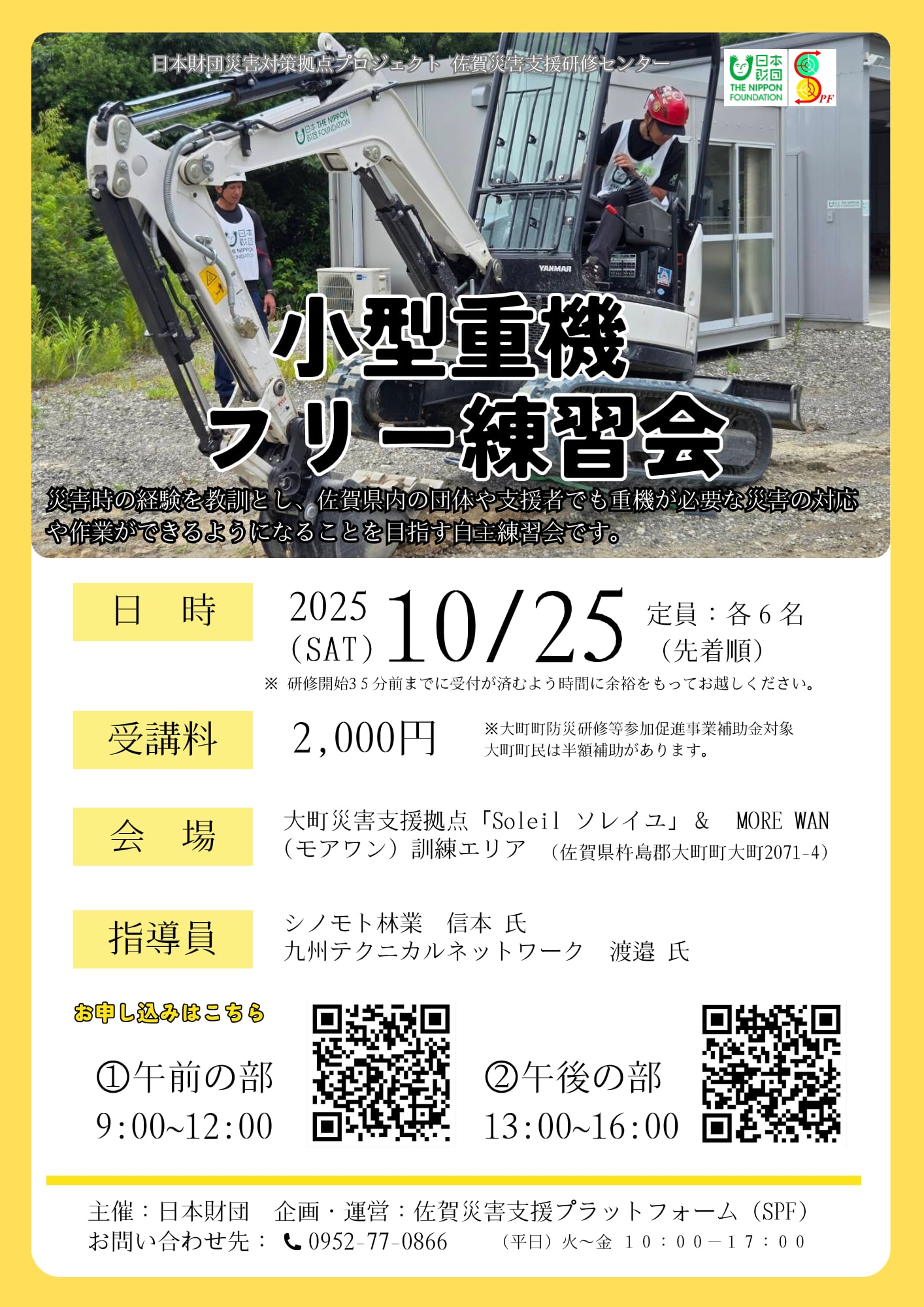 災害時の経験を教訓とし、佐賀県内の団体や支援者でも重機が必要な災害の対応や作業ができるようになることを目指す自主練習会です。