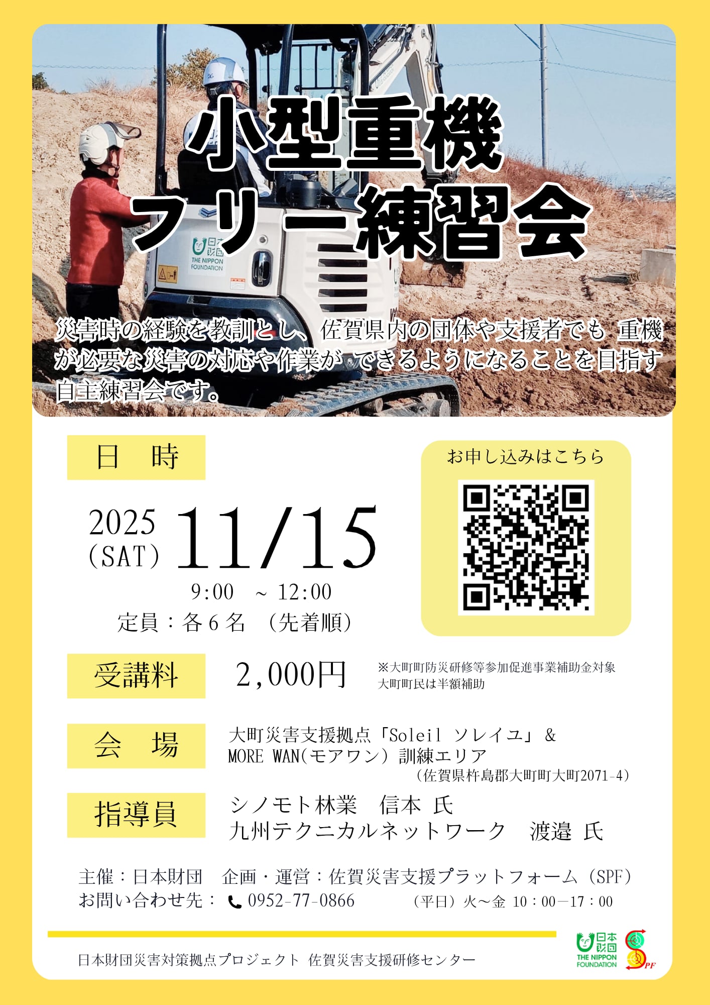 災害時の経験を教訓とし、佐賀県内の団体や支援者でも重機が必要な災害の対応や作業ができるようになることを目指す自主練習会です。