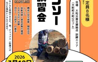 2026年1月24日(土)、下記のとおり、チェーンソー講習会を開催いたします。皆様のご参加をお待ちしています。 1月24日(土)災害時のチェーンソー講習会 災害現場で活動する講師が基本操作・練習 [...]