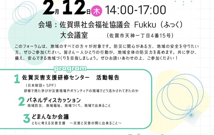 そのような情勢に対応するために、県内の行政・社協・CSO等の県内民間団体のつながりを強め、災害支援の専門家と連携して、災害支援のエキスパートや地域の自主防災組織やCSOの育成と地域住民をはじめ、県内外の方々の防災、減災意識を高めることを目的に災害関係の研修やネットワークづくりを年間を通しておこなっていきます。